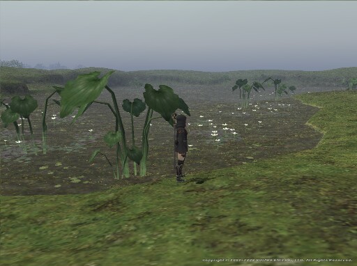場所は現在のOPの位置あたり。 周辺の敵はらく〜つよなので、待ち時間にカニを殴ったりしてました。 沼には傘になりそうな葉っぱが生えてます。 |