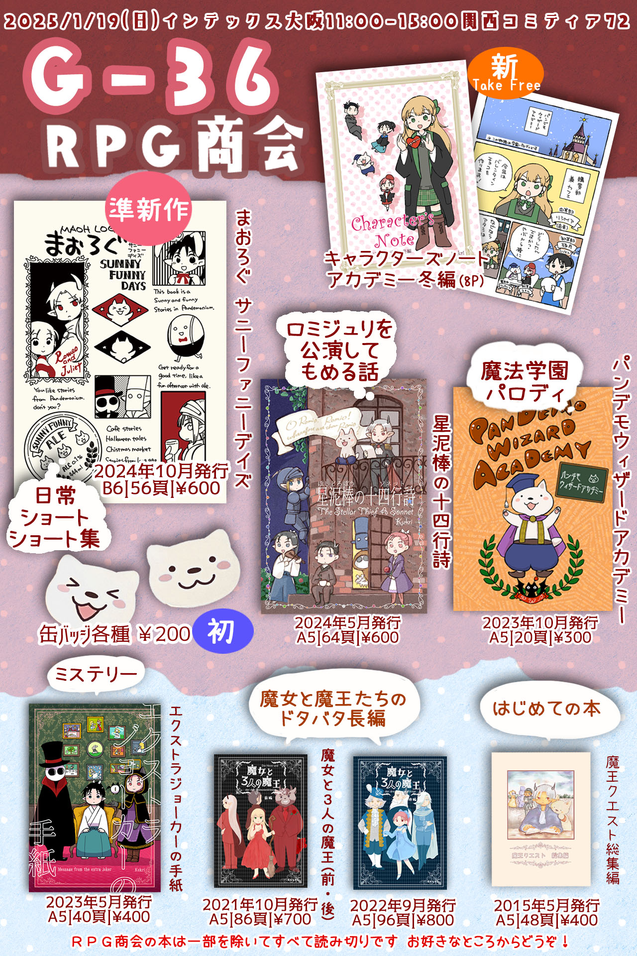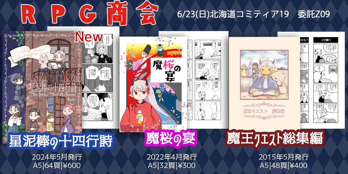 2025年のイベント参加情報です。2025/1/19 関西コミティア72 G-362025/2/2 名古屋コミティア(確定)2025/3/2 九州コミティア(確定)2025/7/6 天に導かれし旅の底(DQ4オンライン)